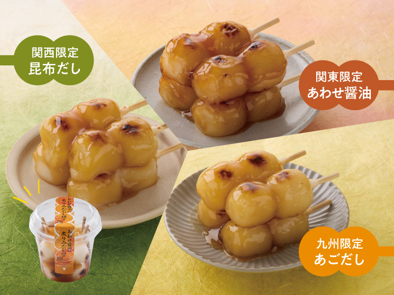 関東では甘じょっぱい醤油たれ、関西では昆布とカツオのだし香る味わい、九州ではあごだしの旨みをきかせた甘口醤油たれと、それぞれの地域の味に合わせて仕立てた炙りみたらし団子です。