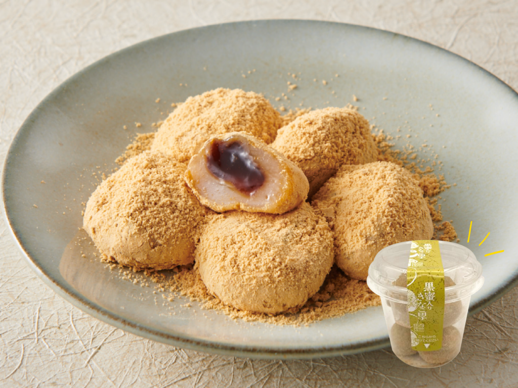 もちっとやわらかな団子生地から、とろりととけ出す濃厚な黒蜜。たっぷりとまぶした香ばしいきな粉にはほんのり塩気をきかせ、甘さを引き立てながらもすっきりとした味わいに仕上げています。