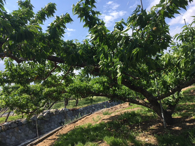 ベテランの桃農家さんが育てている樹木をみると、その見事な枝っぷりに驚きました。「男前だな~」と本当に感動するくらい、大きく力強い、たくさんの実をつける生命力のようなものを感じました。私の写真力でお伝えしきれないのが残念です。
